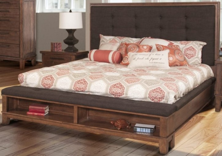 The plush, padded headboard showcases a striking button-tufted design, expertly upholstered in rich dark brown fabric, creating a sophisticated contrast to the set’s warm, inviting finish. This luxurious comfort seamlessly extends to the side rails and bench footboard, all adorned with matching upholstered cushioning, ensuring an elegant and cohesive look throughout the bedroom.