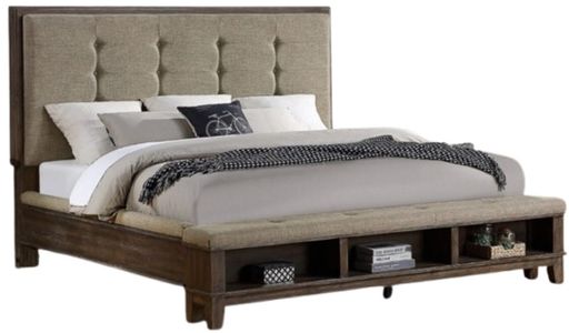 The plush, padded headboard showcases a striking button-tufted design, expertly upholstered in complimentary greige fabric, creating a sophisticated contrast to the set’s warm, vintage finish. This luxurious comfort seamlessly extends to the side rails and bench footboard, all adorned with matching upholstered cushioning, ensuring an elegant and cohesive look throughout the bedroom.