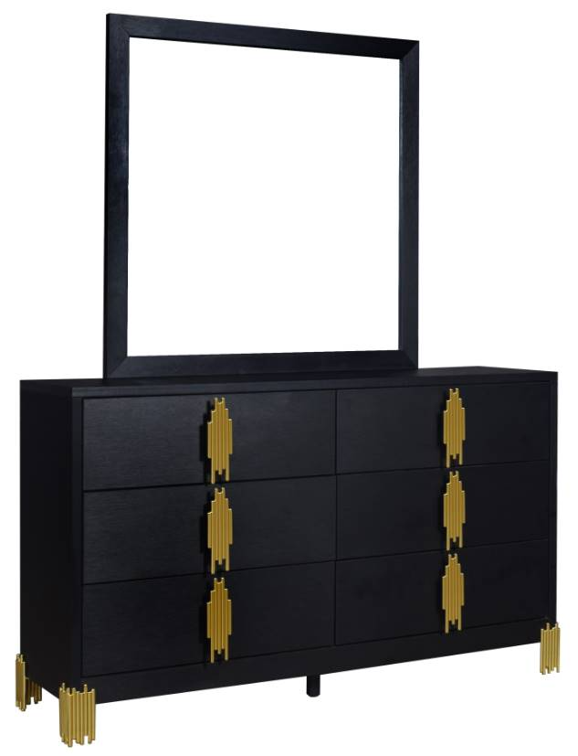 Introducing the Empire dresser in sleek black, a timeless addition to your bedroom decor. Crafted with durable eco-friendly materials and a sophisticated finish, this dresser exudes contemporary elegance. Its black framed, beveled low distortion design ensures a true reflection, adding depth and style to your decor.Read More