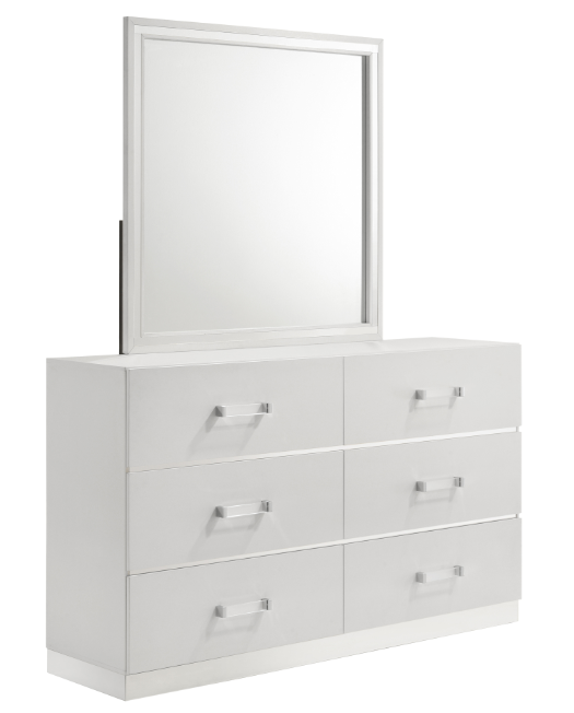 Sleek, Modern Design: The sophisticated look is achieved with the gleaming white finish, mylar accents, and acrylic drawer pulls