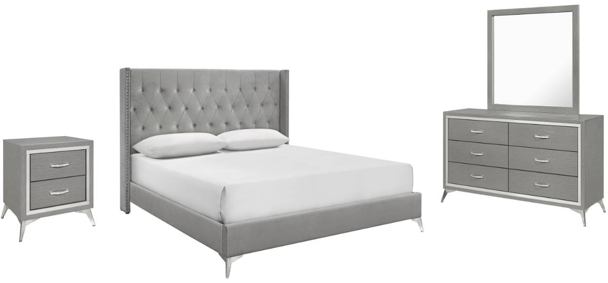 The Huxley bedroom set combines sleek modern design with timeless elegance. Featuring a gray finish, the set includes a king panel bed, dresser, mirror, and nightstand, offering both style and functionality.Read More