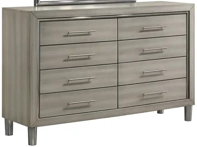 The furniture features a specialty metallic finish over wood that mimics the modern, polished look of stainless steel while offering exceptional durability and scratch resistance. It enhances the light gray finish, adding a sleek, sophisticated touch ideal for a contemporary ambiance.