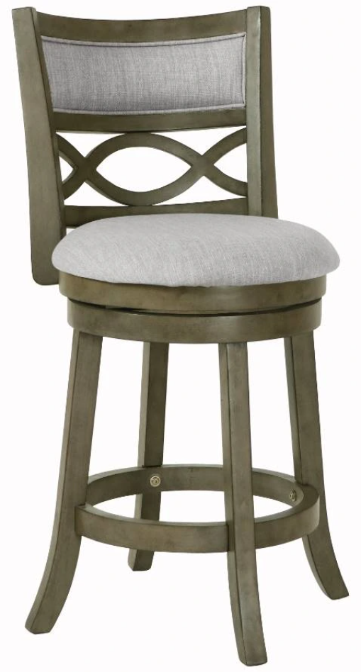 Featuring a seat height of 24”, the stool's legs are reinforced by a circular footrest, providing added stability and functionality. With a 360-degree swivel, this barstool effortlessly rotates for convenient use at kitchen islands or bars. The full foam seat cushions and backrests, upholstered in easy-care light gray 100% polyester fabric, offer a plush and cozy seating experience. The distinctive interlocking wave wood back and thickly welted upholstery add a touch of sophistication to the overall design. Easy assembly is a snap with the included instructions. Elevate your bar, counter, or kitchen island with the Manchester Bar Stool, where durability meets distinctive style.