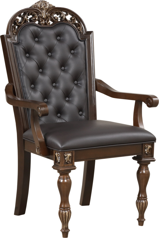 The multi-step cherry finish enhances the natural wood grain, while delicately burnished gold tipping adds a luxurious touch to the intricate carvings. Inspired by Baroque and Rococo styles, the ornate detailing brings an air of regal elegance and sophistication to your dining space. Upholstered in sumptuous chocolate brown vegan leather, the button-tufted backs and plush cushions offer both an elegant look and supportive, comfortable seating for a truly luxurious dining experience.