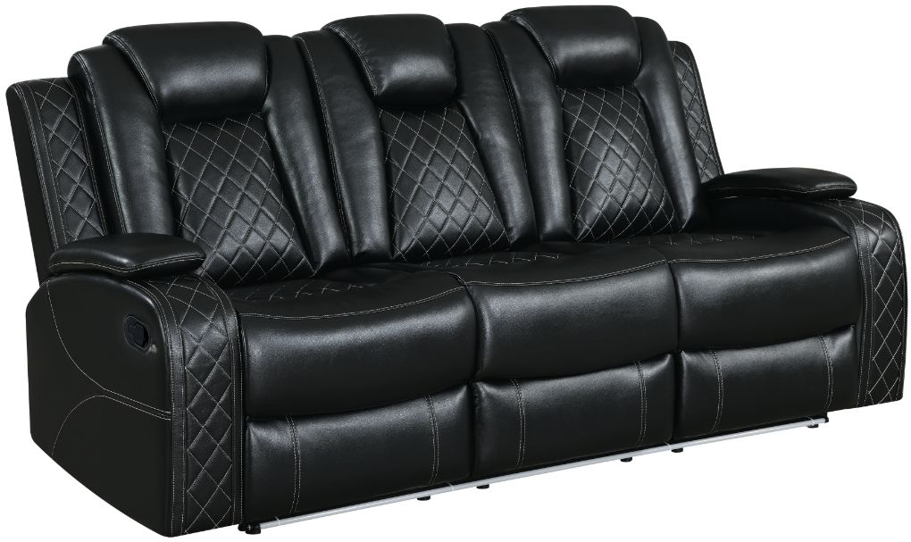 Thanks to top-quality reclining mechanisms, relaxation is effortless as you lean back into plush seating supported by high-density foam and pocket coil cushions wrapped in Dacron. Expert tailoring is evident in the sleek design, accentuated by white contrast stitching and a distinctive diamond pattern on seats and arms. Lift up pillowed arms reveal convenient storage compartments, while theater lighting along the base and reading lamps under the center headrest create the perfect ambiance. With a drop-down center back cushion housing wireless charging pads and USB charging ports, convenience meets contemporary elegance in the Orion sofa.