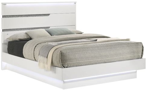 Glitz and Glam: The ambient glow of the LED lighting on the platform and headboard reflect the modern white finish and the glittering silver mylar inlays