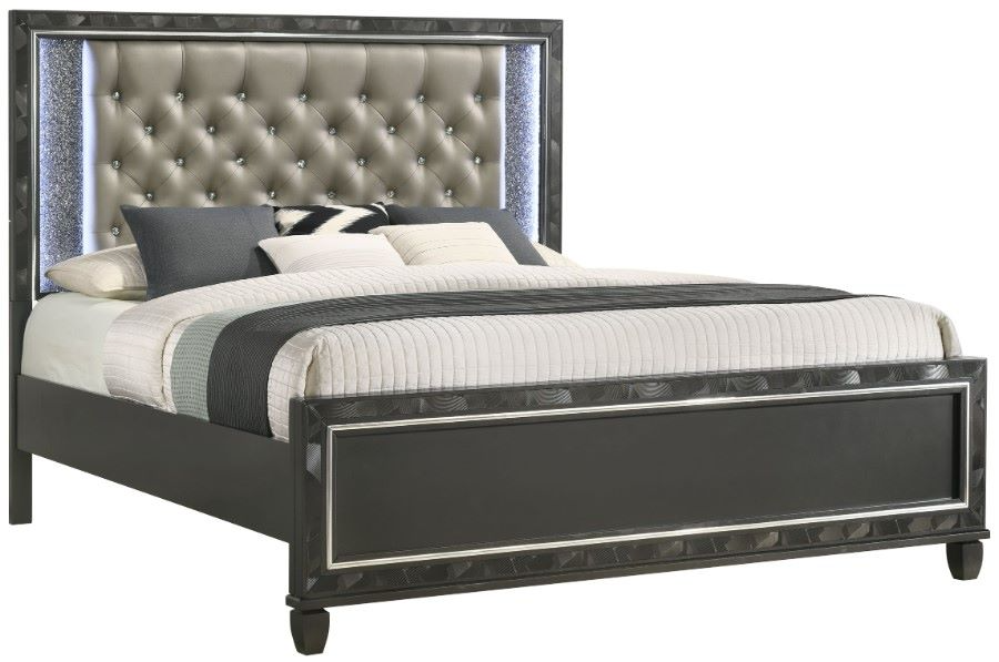 Glamorous Details: Glossy black textured black inlays, mylar trim and a crushed crystal look decorative laminate frame the plushly upholstered, crystal button tufted headboard for an eye-catching, opulent appeal