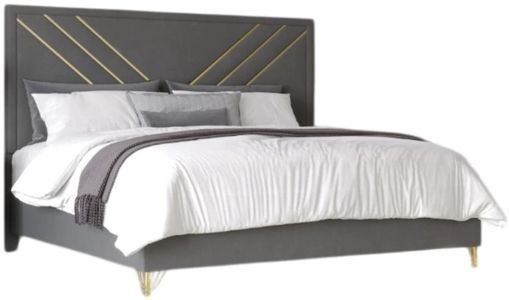 Trendsetting gold metal and mylar accents dazzle against the ultra-soft gray fabric drawer fronts, while intricate detailing adds a touch of sophistication to the elegantly designed legs.
