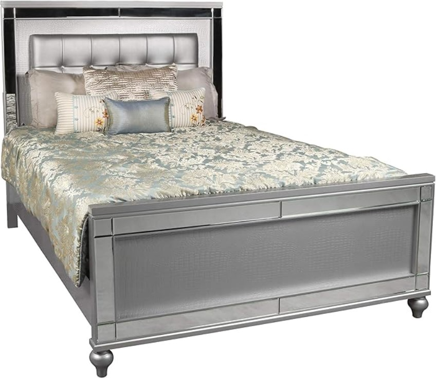 Crystal button tufted padded headboard, gleaming silver finish, mirrored trims, crystal studded drawer pulls, and alligator embossed inlays evoke a Hollywood glam appeal.